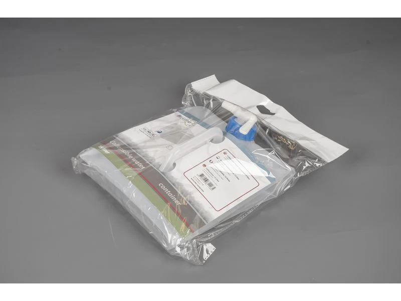Een opvouwbare jerrycan. Ideaal om mee te nemen onderweg of voor gebruik op de camping. Na gebruik kan de jerrycan compact worden opgevouwen en opgeborgen. De jerrycan is voorzien van een handig tapkraantje, een stevig handvat en een ophangoog.