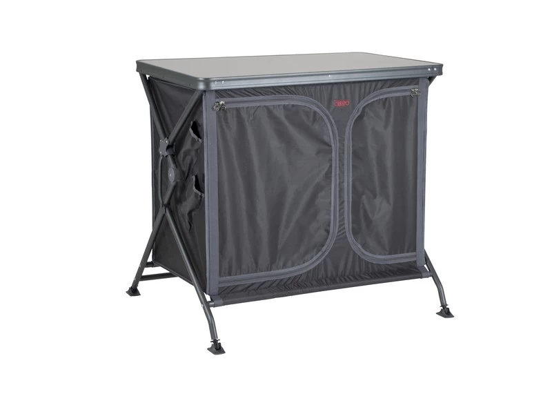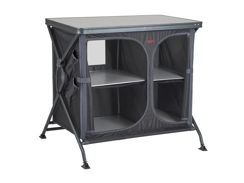 Een zeer stabiel en stevig kookeiland. Zeer eenvoudig op te zetten door een uniek systeem voor het in- en uitklappen van deze kast! Deze kook-/legkast beschikt over een grijs oplegblad van melamine. Waardoor het hittebestendig en watervast is. De aluminium behuizing is stijlvol zwart. De hoes is gemaakt van extra stevig 400 denier polyester met daarin 4 handige legplanken, aan de zijkant 4 vakken en een mesh raam aan de achterkant. De verstelbare poten met stabilisatoren zijn afzonderlijk af te stellen zodat de legkast op iedere ondergrond stabiel staat. De kast wordt geleverd in een draagtas.