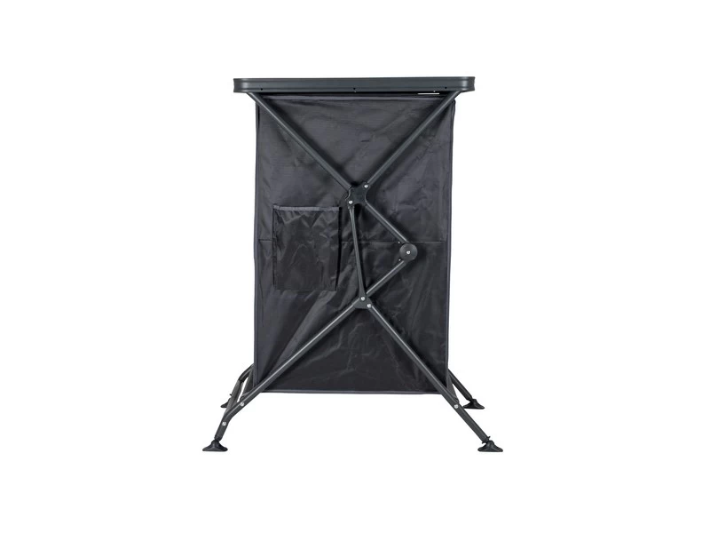 Een zeer stabiele en stevige opbergkast. Zeer eenvoudig op te zetten door een uniek systeem voor het in- en uitklappen van deze kast! Deze legkast beschikt over een aluminium frame en een grijs melamine oplegblad waardoor het blad hittebestendig en watervast is. De hoes is gemaakt van extra stevig 400 denier polyester met daarin 2 handige legplanken, aan de zijkant 2 vakken en een mesh raam aan de achterkant. De verstelbare poten zijn afzonderlijk af te stellen. De stabilisatoren zorgen voor extra stabiliteit zodat de legkast op iedere ondergrond stabiel staat. Wordt geleverd in een draagtas. Ingeklapt (lxbxh): 78x56x14 centimeter.