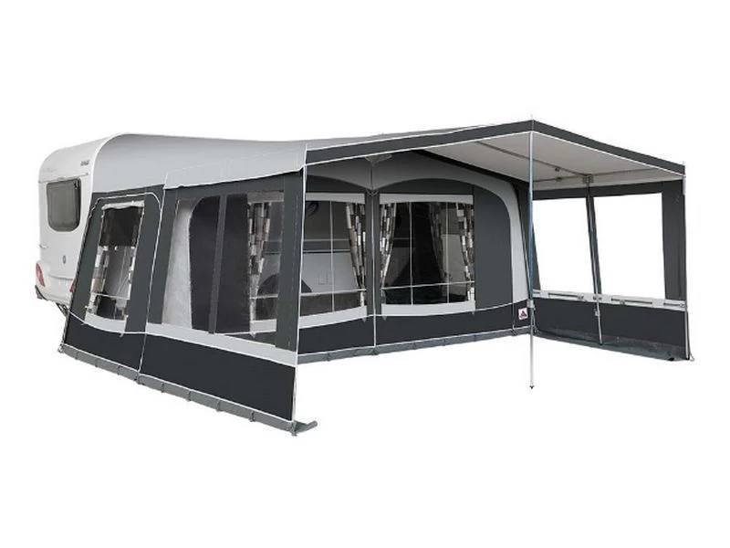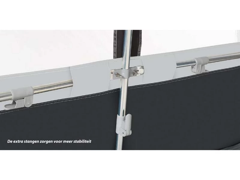 Het extra stevige Ten Cate All Season tentdoek en het versterkte 25mm luifelframe zorgen voor extra stabiliteit en maken deze voortentluifel bij uitstek geschikt voor seizoensgebruik. Standaard zijn alle stangen voorzien van EasyGrip buisklemmen voor extra gebruiksgemak. De zijwanden van de Locarno Season zijn volledig uitritsbaar. Een waardevolle uitbreiding van het reeds uitgebreide Doréma-luifelassortiment.